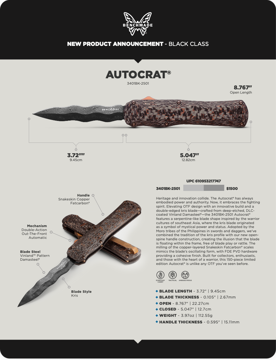 BENCHMADE 3401BK-2501 LIMITED EDITION Benchmade Autocrat 3401BK-2501 Black Class Limited Edition – Vinland Damasteel Kris Blade – Snakeskin Copper FatCarbon